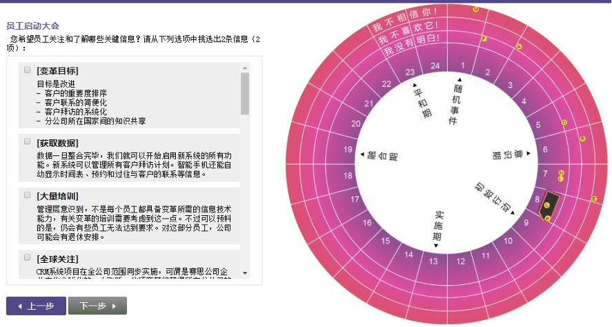 ChangeMan以完全仿真的实战模拟为载体,通过“沙盘游戏”+“电脑商战模拟”,生动展示还原创新、变革的六个阶段和各个阶段的挑战,形象地展示了各种参与者的变革立场、所处阶段和对变革的抗拒水平。